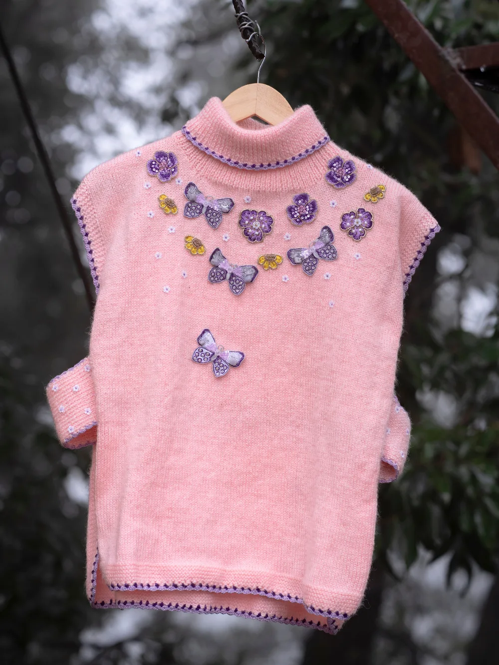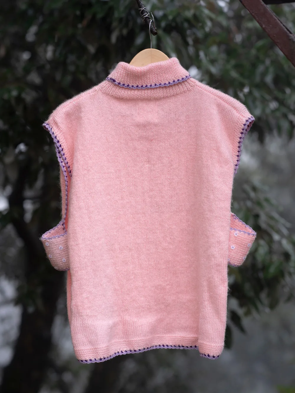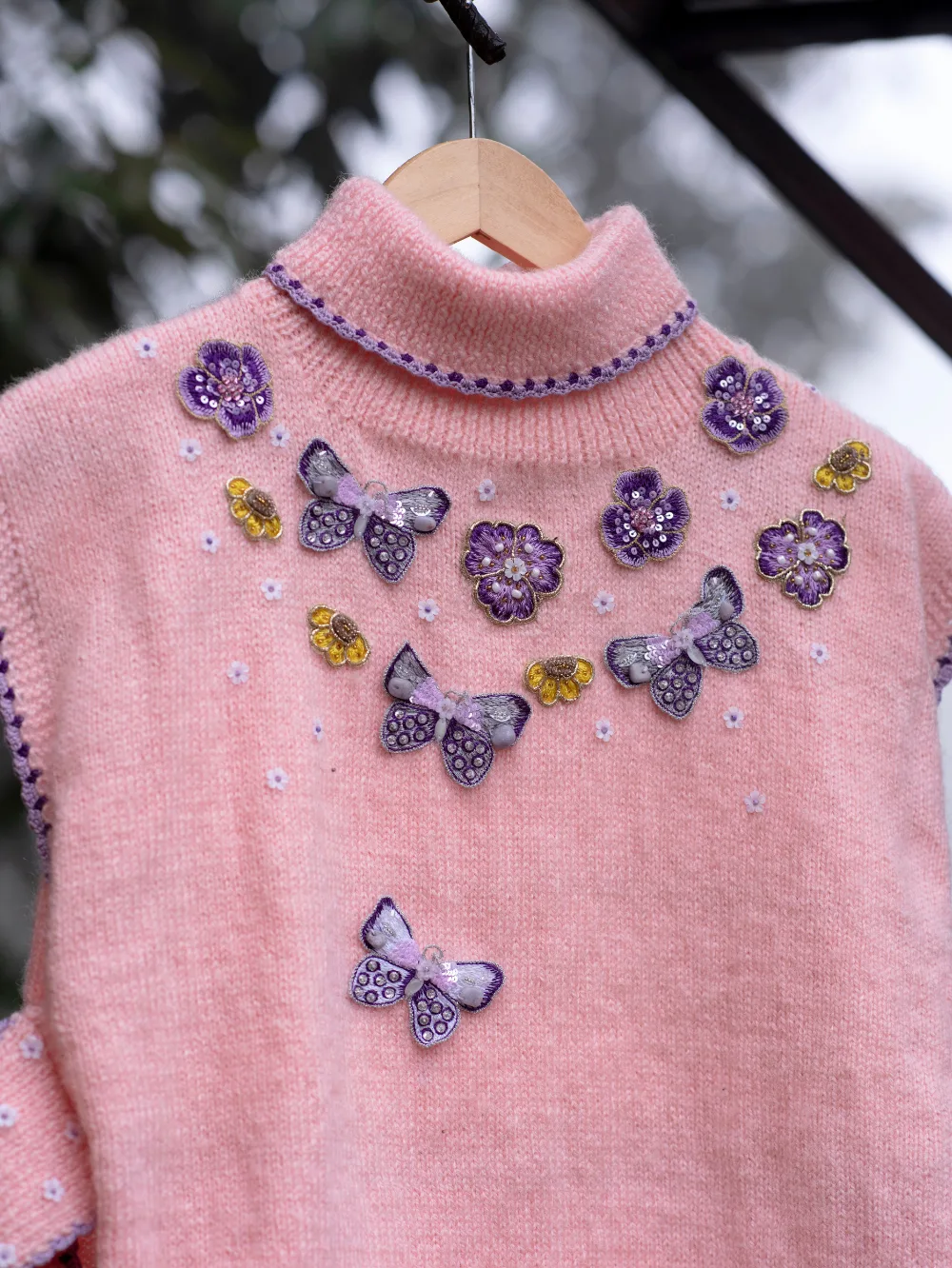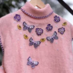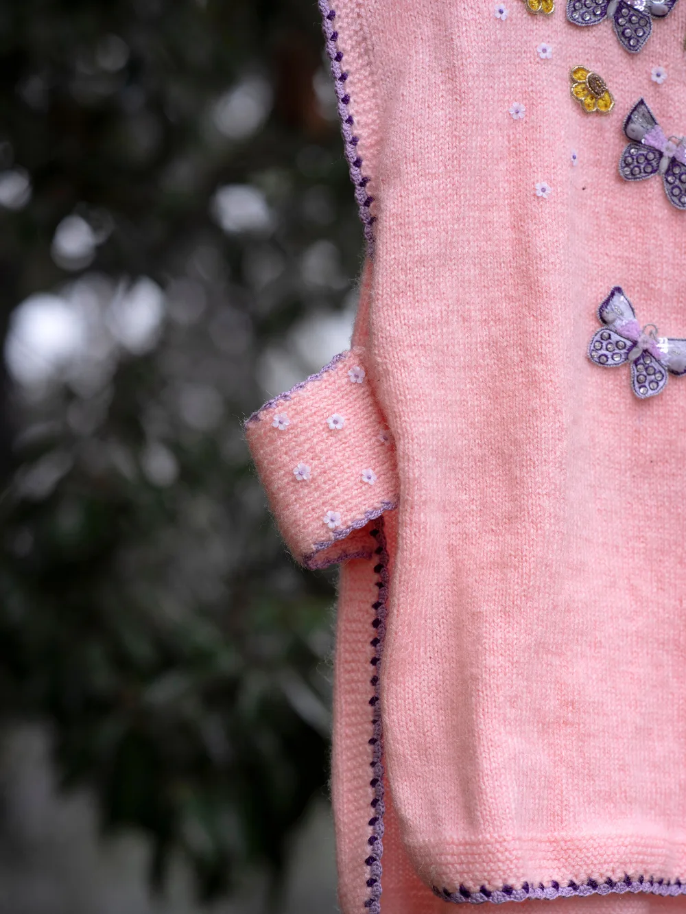 This Blooming Wings sweater, lovingly crafted by the skilled women of Uttarakhand, is a blend of elegance, warmth, and tradition. Its soft blush tone is adorned with intricate hand-embroidered butterflies and delicate floral patterns on the front, symbolizing nature’s beauty and grace. The finely detailed crochet borders add a unique charm, showcasing the artisans’ dedication to their craft.