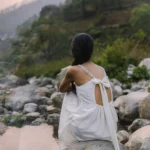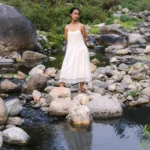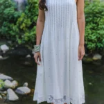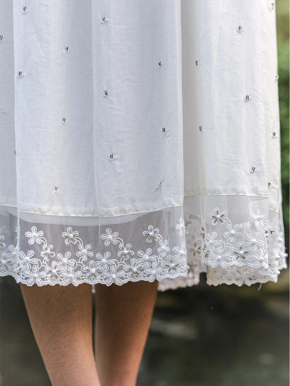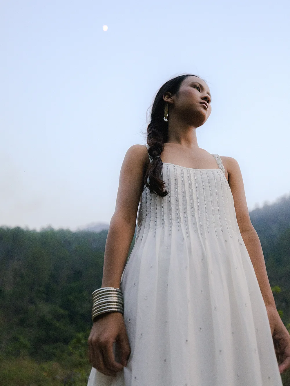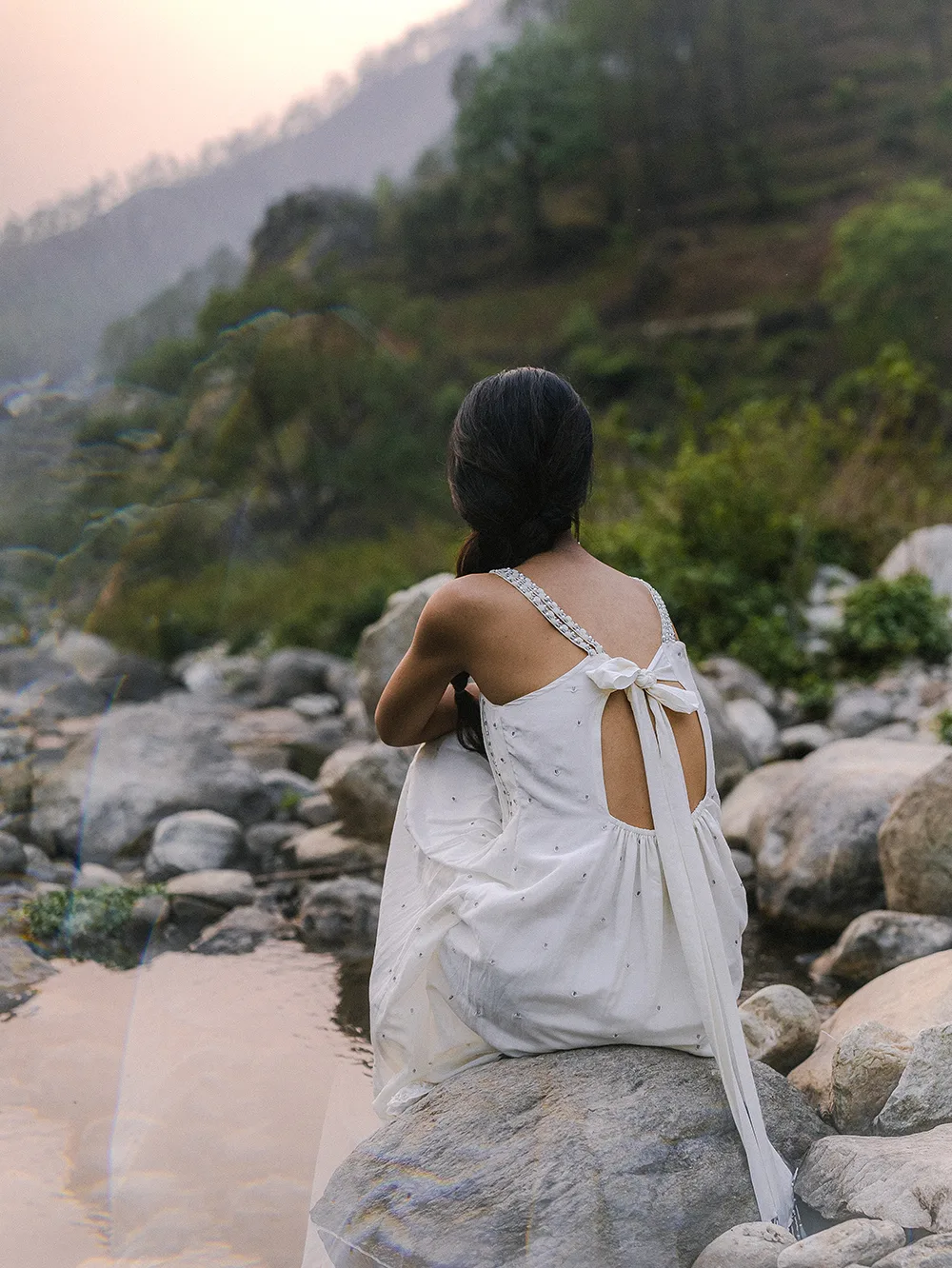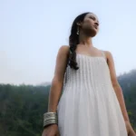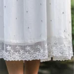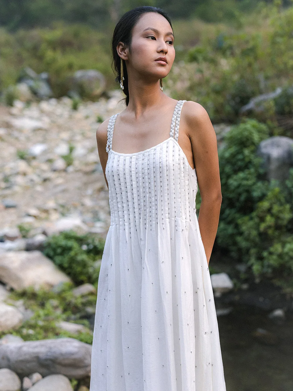 Organic Cotton silk white dress with delicate hand-placed stone embellishments, lace hem, and graceful back tie inspired by Uttarakhand’s serene landscapes.