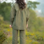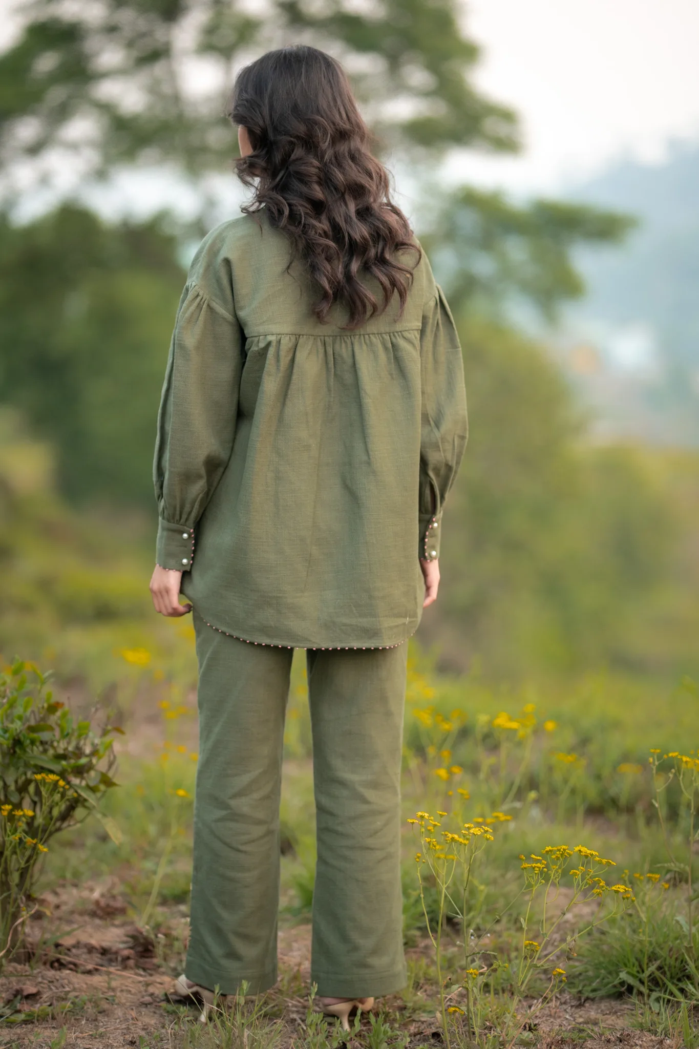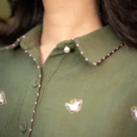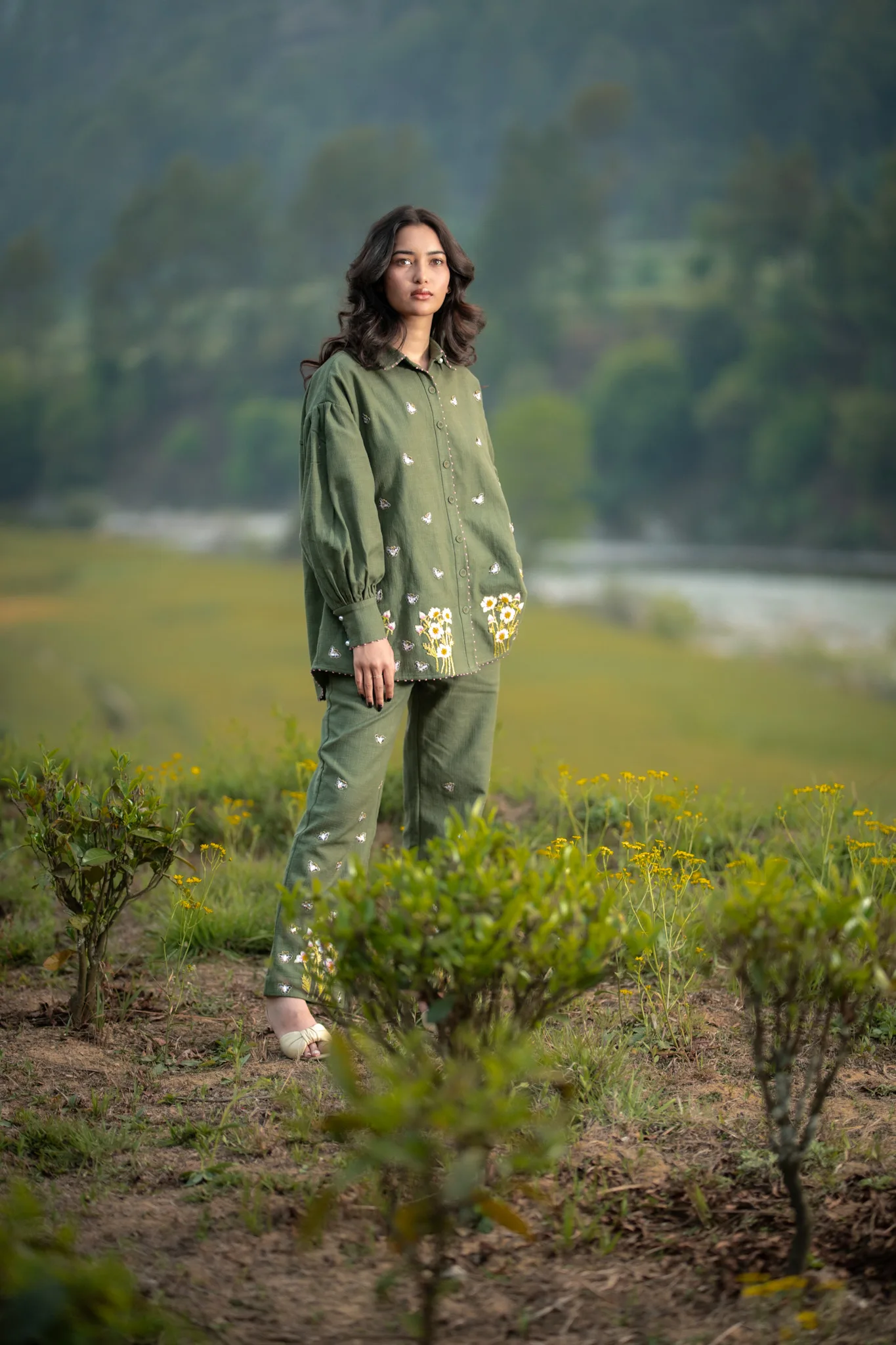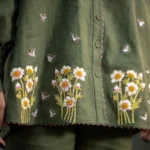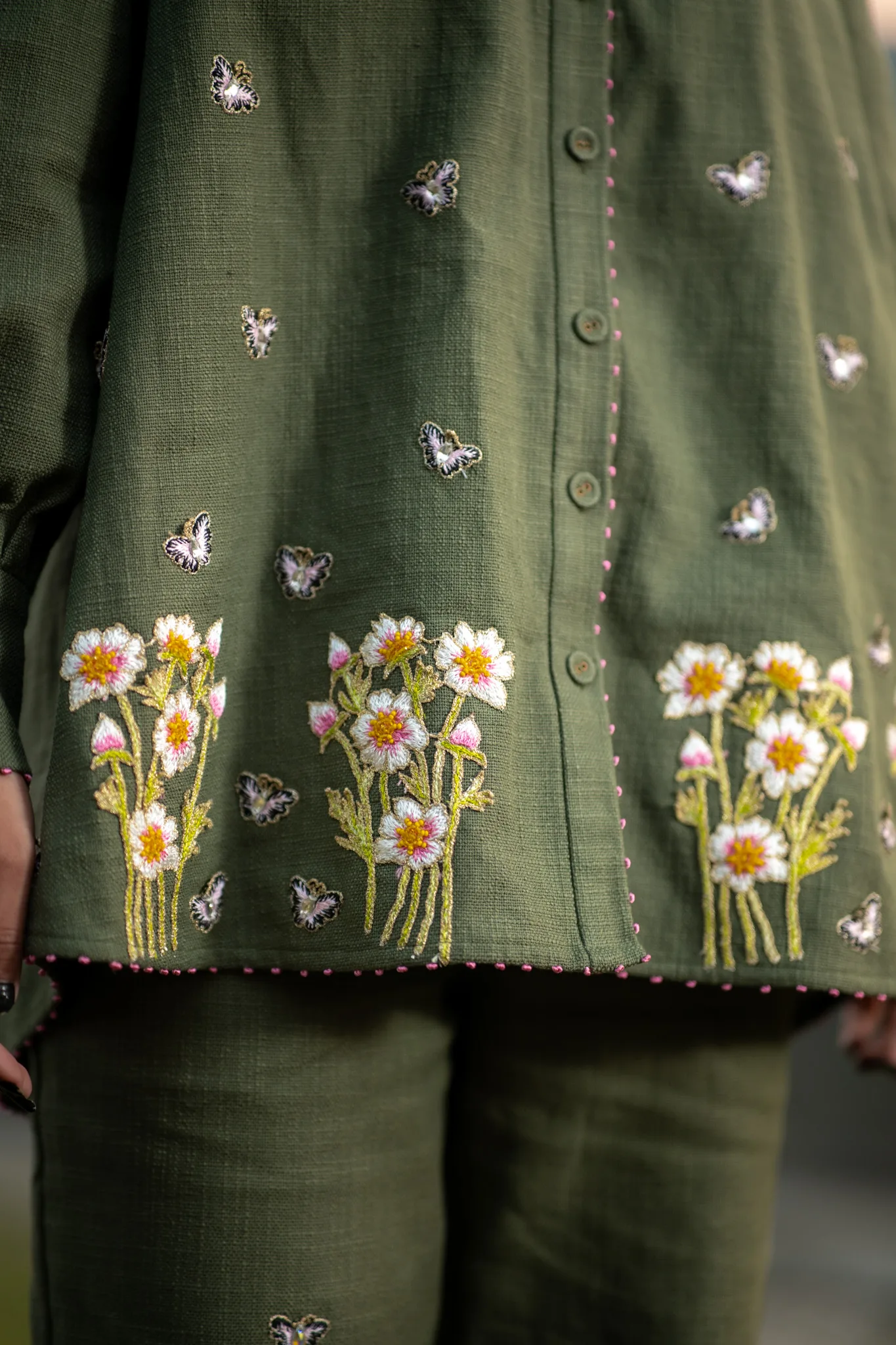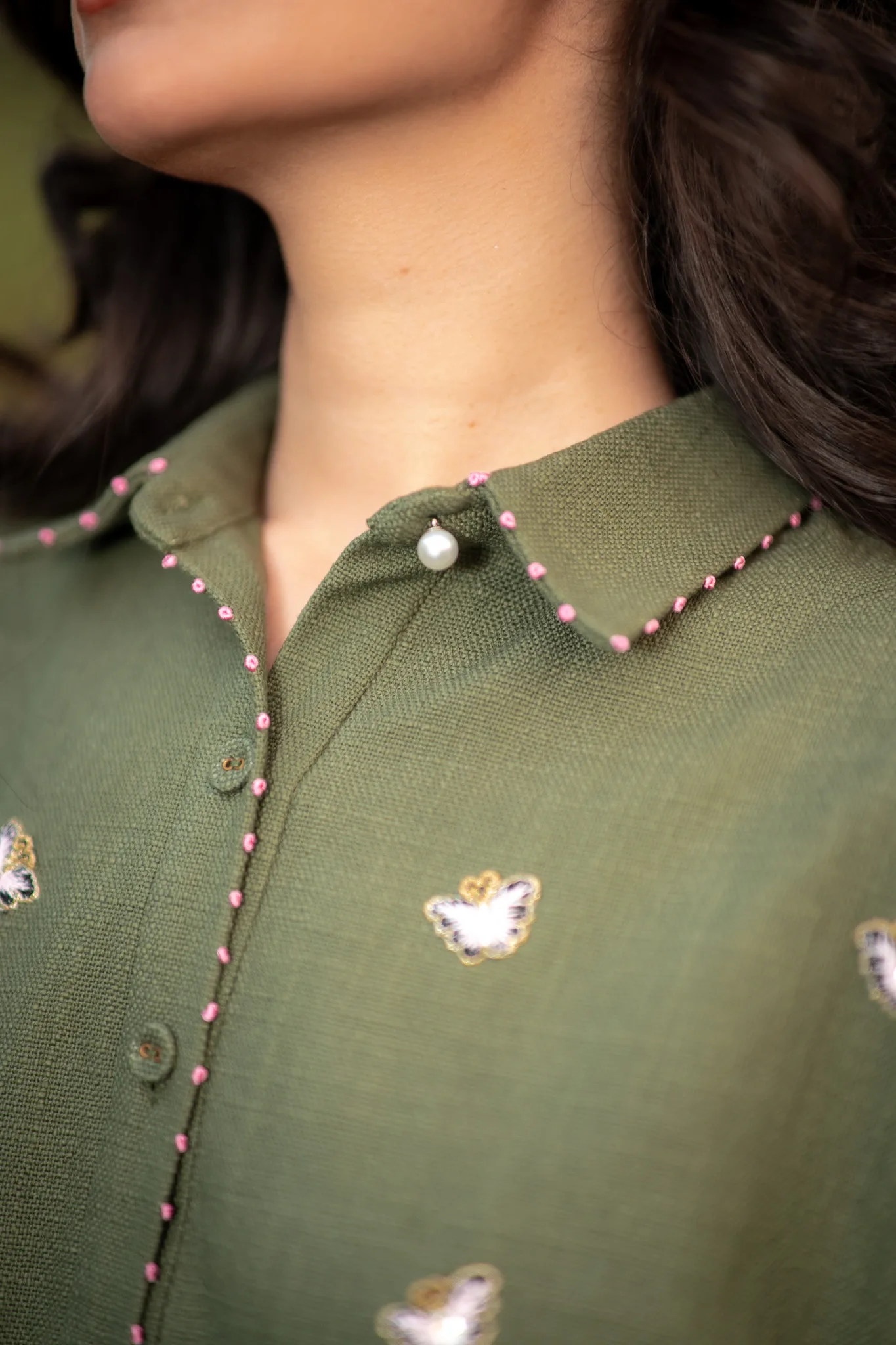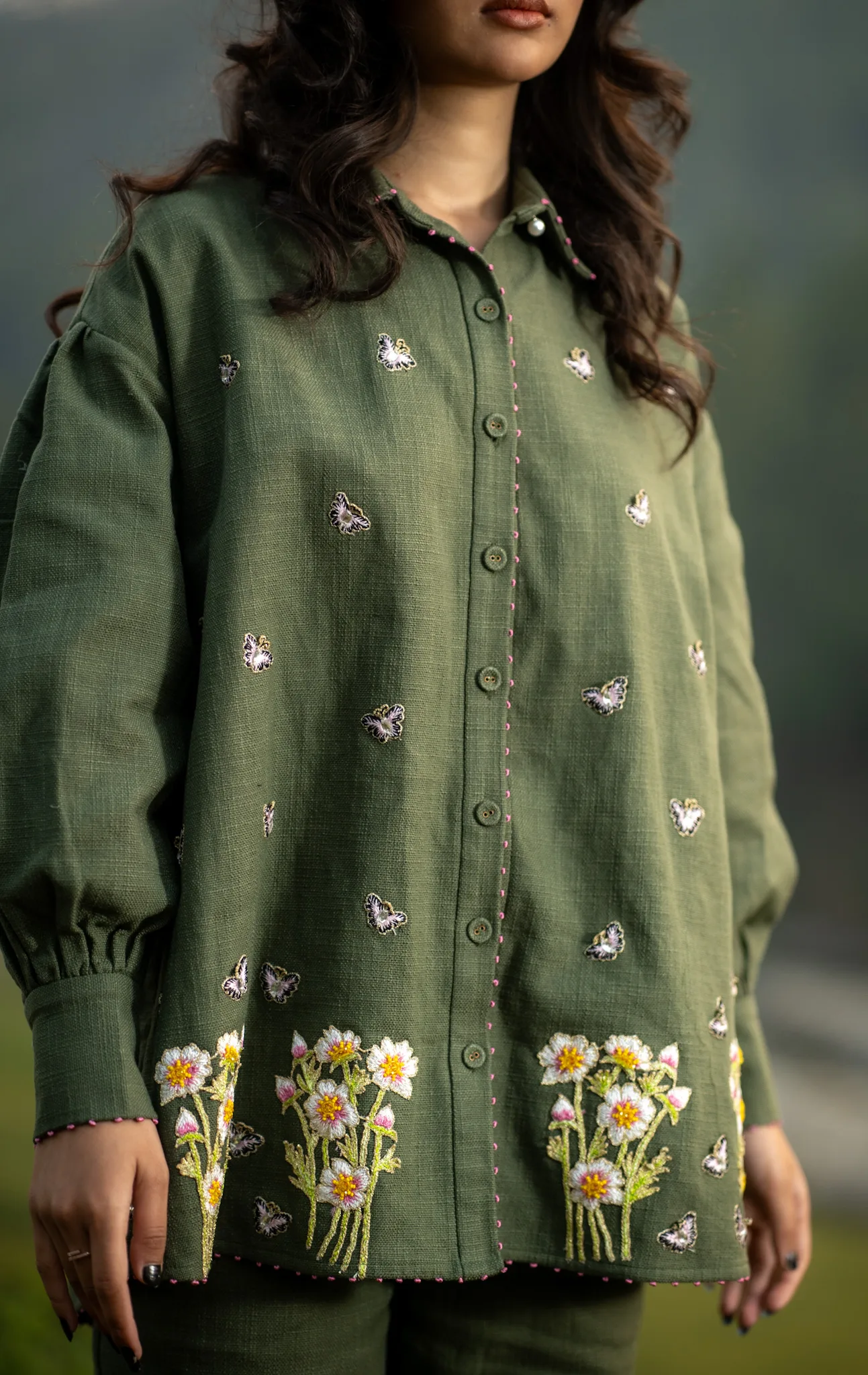 Warm green hemp shirt crafted in hemp cotton features hand embroidered daisies and butterflies. Puffed sleeves adds a gentle feminine touch with pink knots details showing the artisanal hand work done perfectly to add a touch of serene meadow which looks both poetic and romantic.