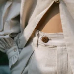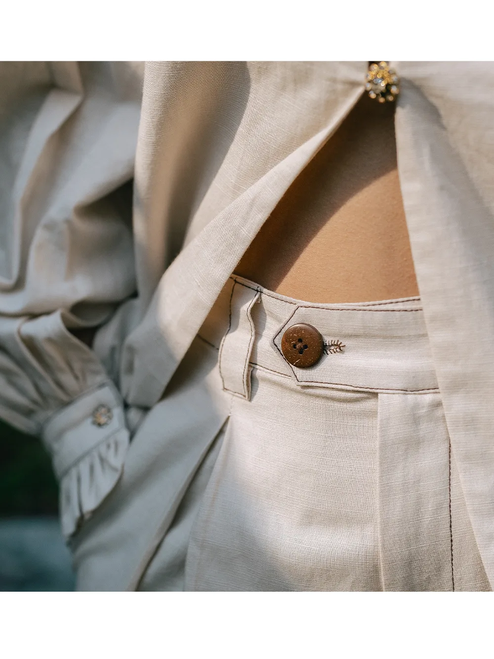 Thread detailing on pants with wooden buttons – structured yet relaxed – magnetic closure on bottom –