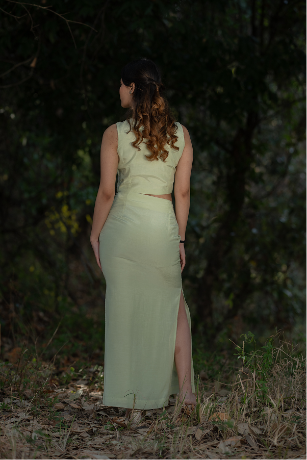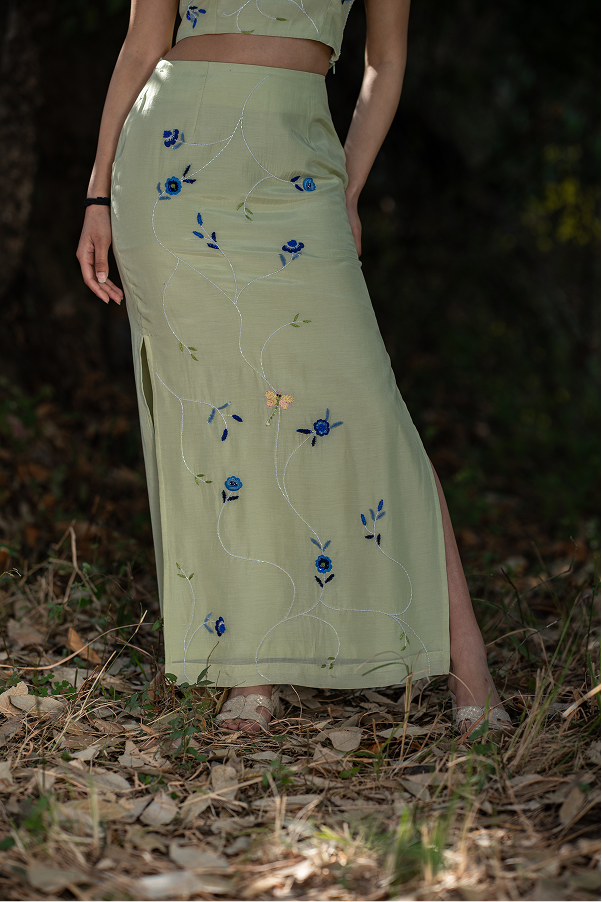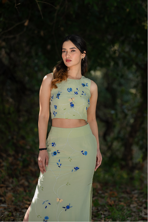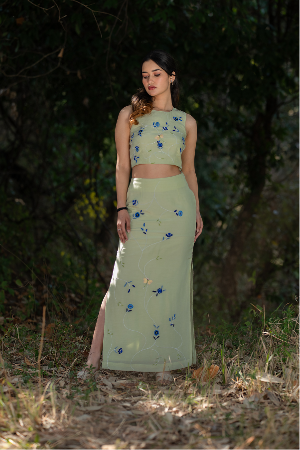 Crop top – fitted skirt with side slit – hand embroidered floral pattern- Structured yet fluid fit