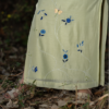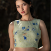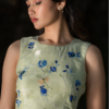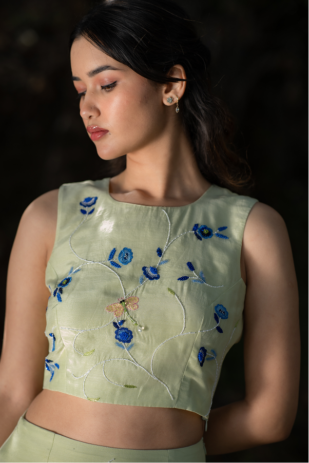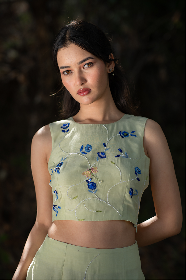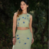 A neon green co-ord set with blue floral hand embroidery inspired by summer blooms, where contrasting hues create a vibrant, fresh statement.