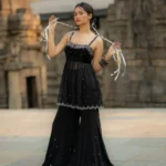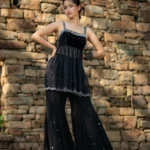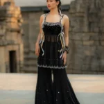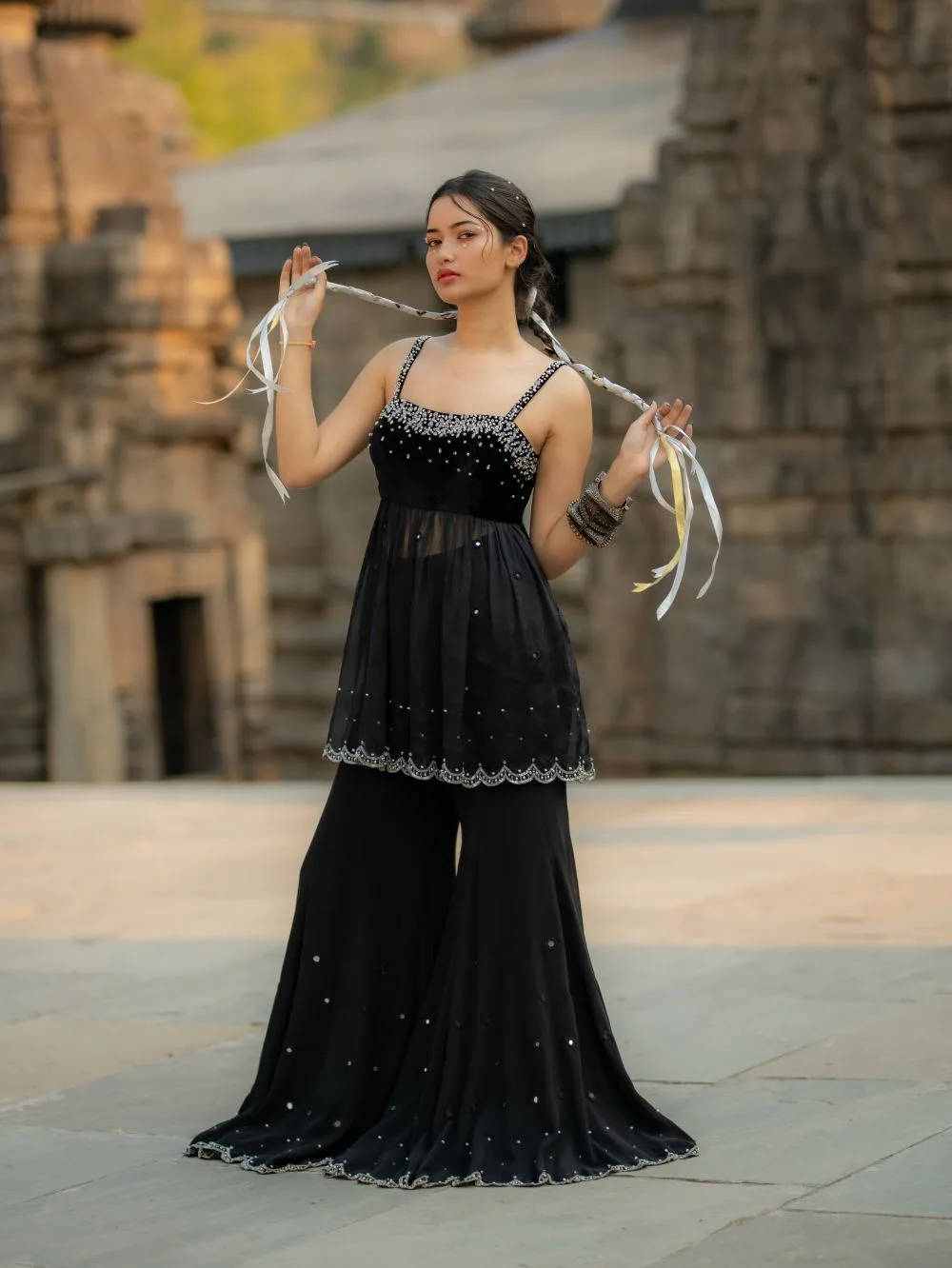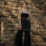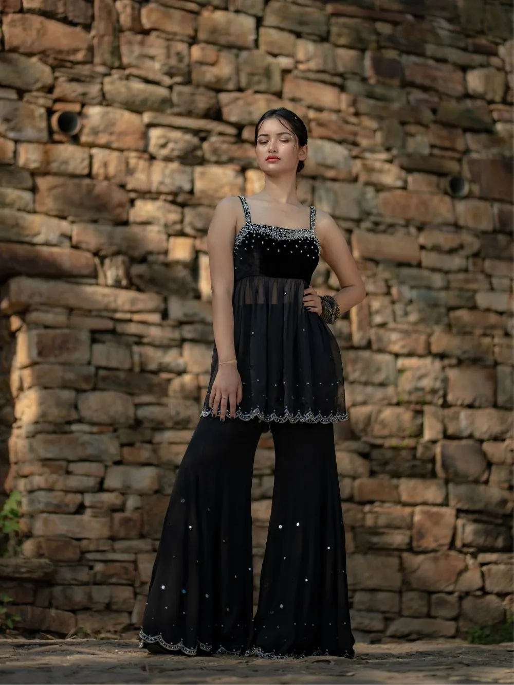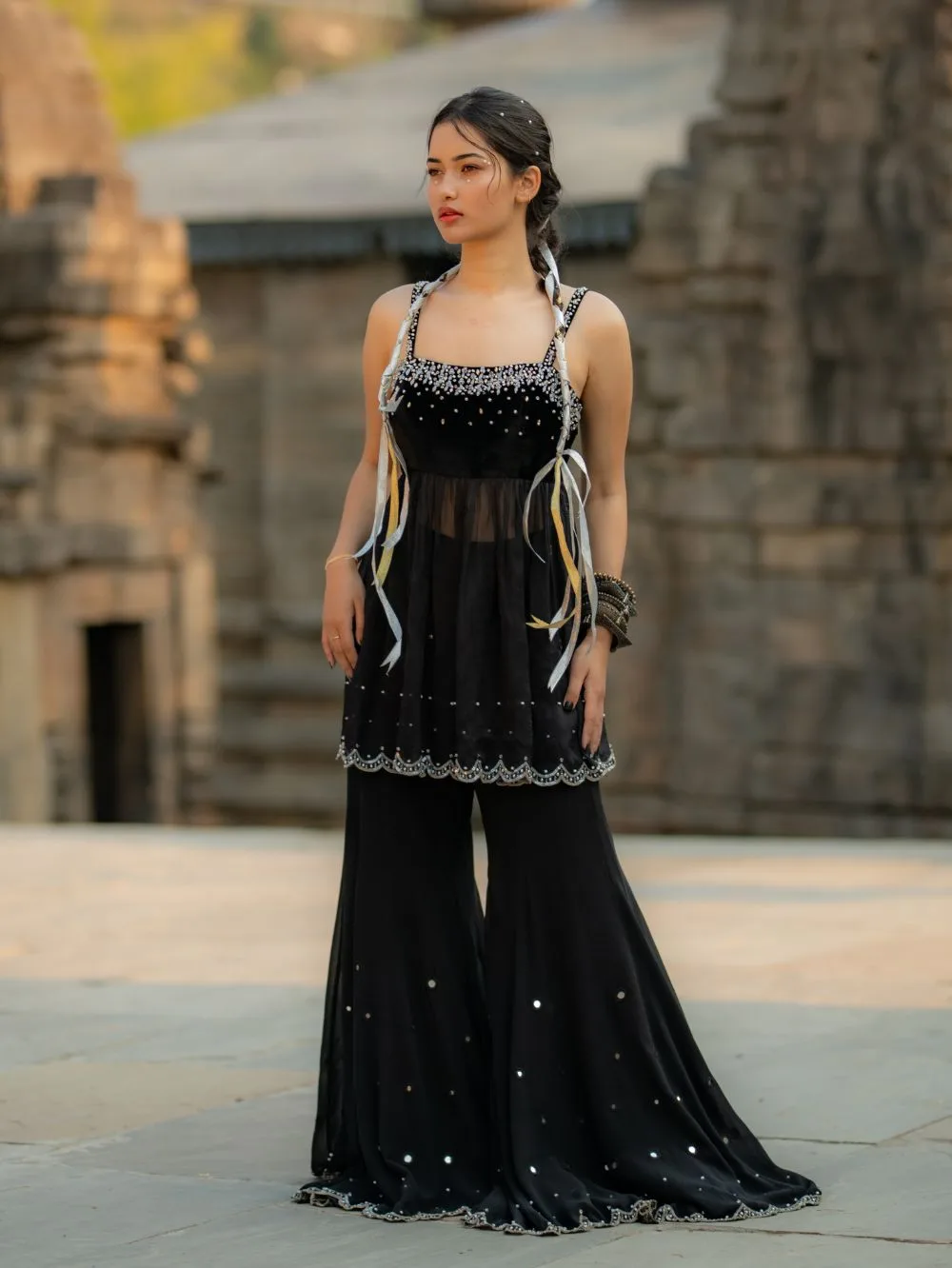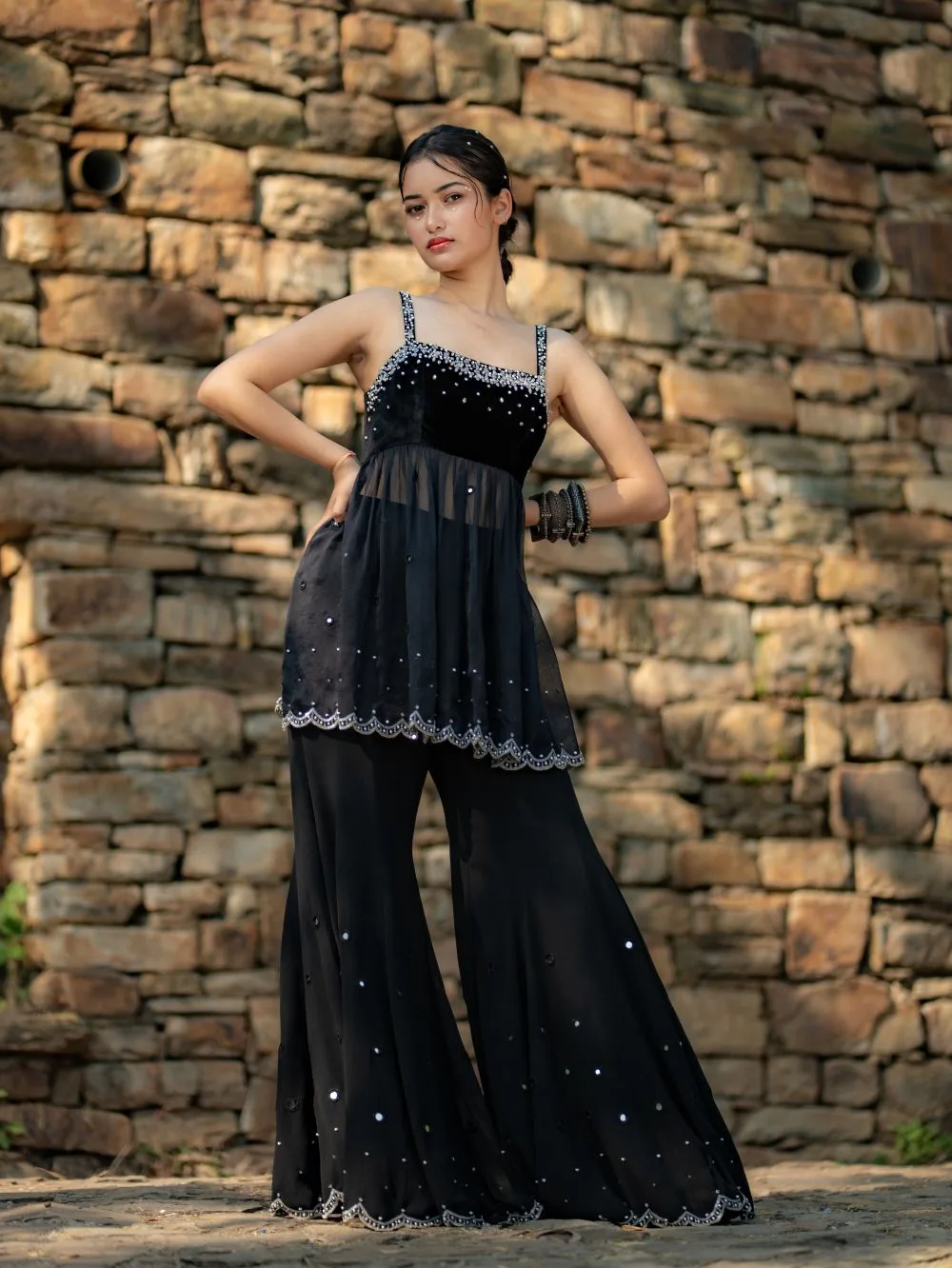 Starfall Flare PantsInspired by the clear, starry skies that blanket the Himalayan peaks of Uttarakhand,Crafted from pure black georgette mirror work, crystal beads, and sequins embroidered along the hem mimic the twinkling stars