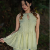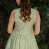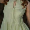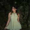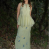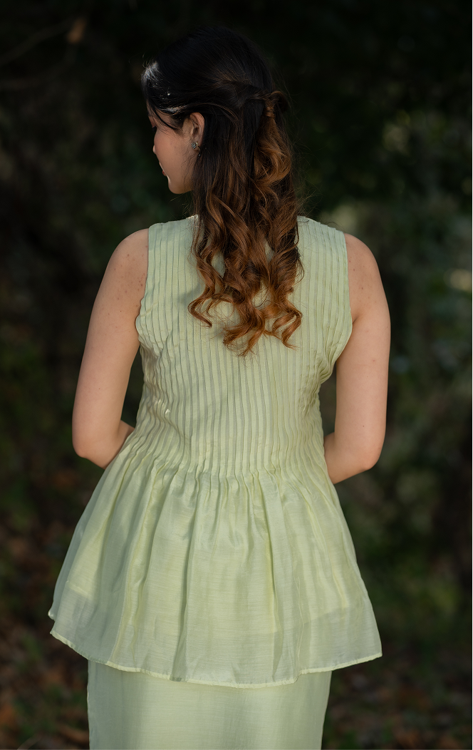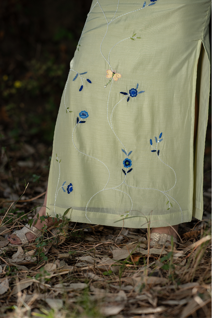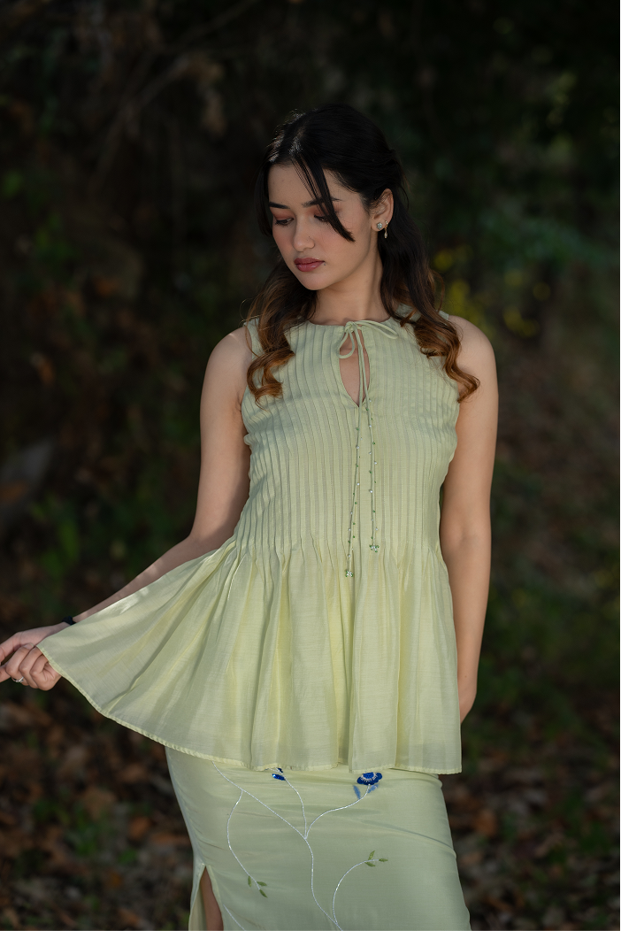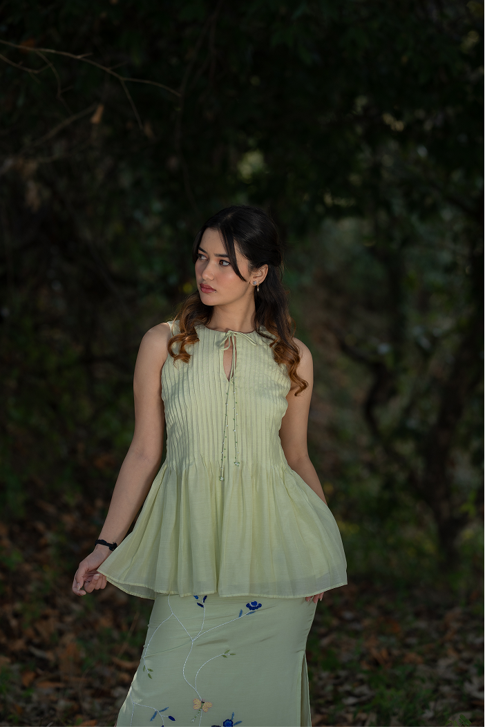 A lush neon green co-ord set featuring a flared pleated top and a fitted skirt with a side slit. The skirt is hand-embroidered with contrasting blue floral motifs, adding a vibrant, summer-inspired charm and artisanal elegance.