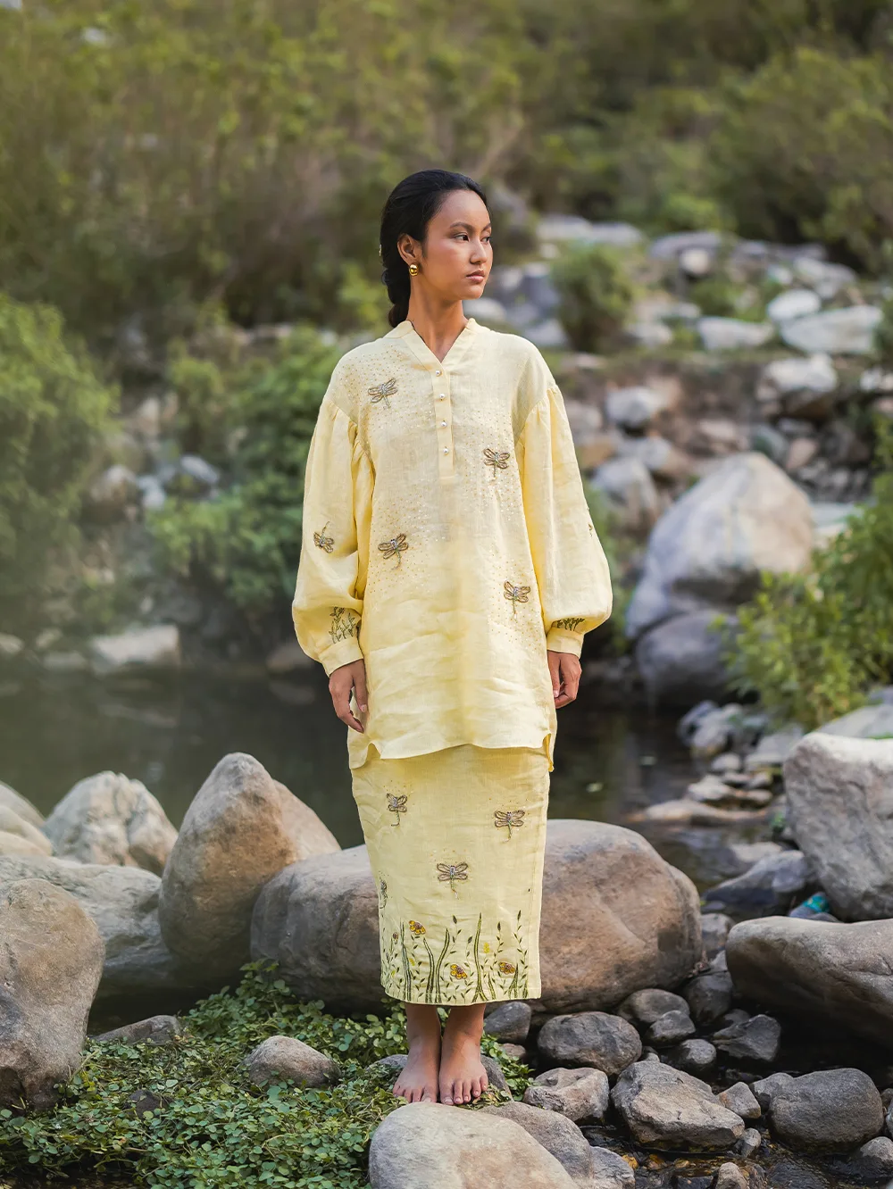 oversized shirt – Puffed sleeves – dragonfly hand embroidered detail – Comfort fit – soft details on sleeves – Fitted skirt – back slit – Hand embroidered dragonflies – ferns – flowers motifs.