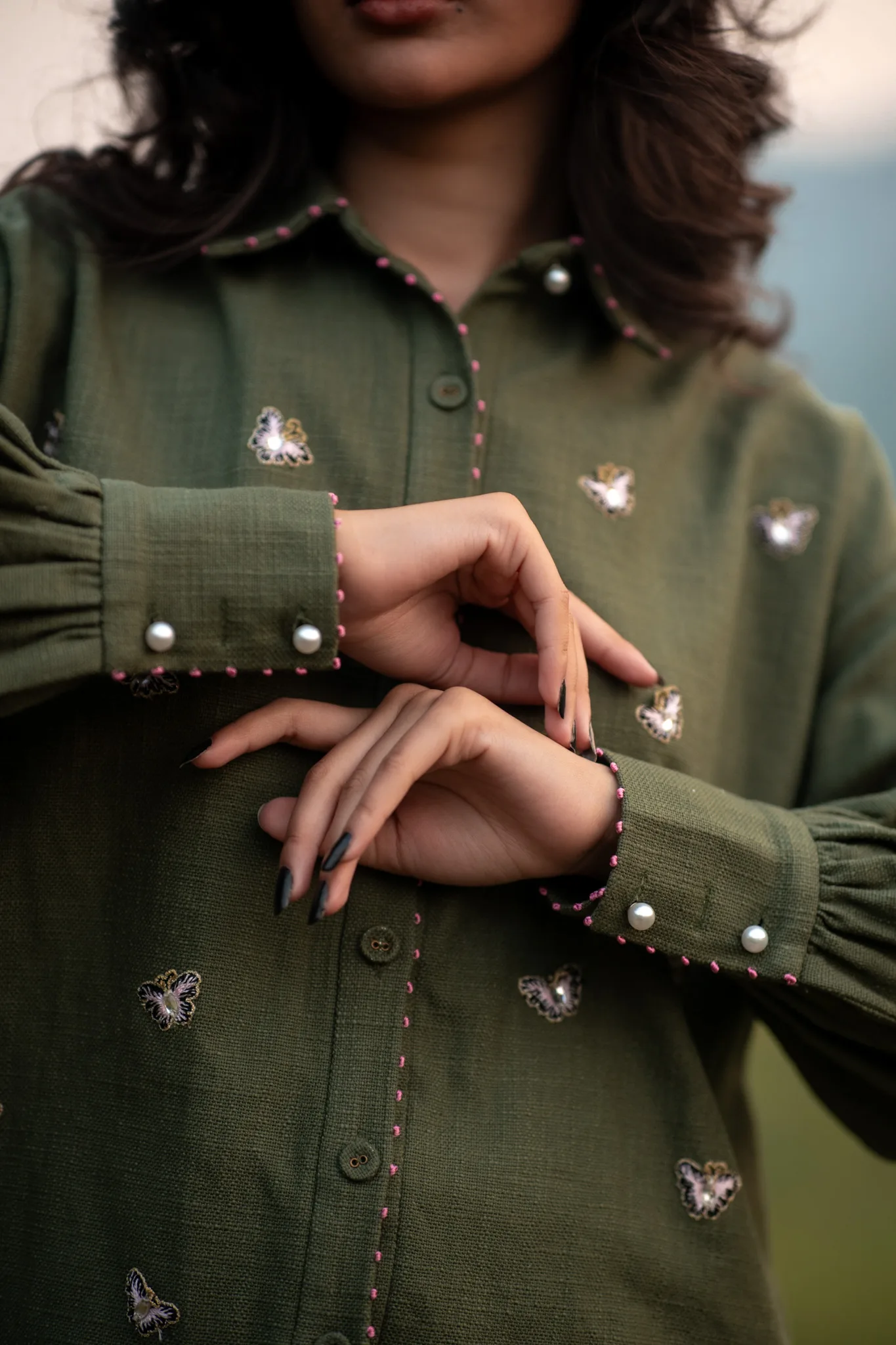 Warm green hemp shirt crafted in hemp cotton features hand embroidered daisies and butterflies. Puffed sleeves adds a gentle feminine touch with pink knots details showing the artisanal hand work done perfectly to add a touch of serene meadow which looks both poetic and romantic.